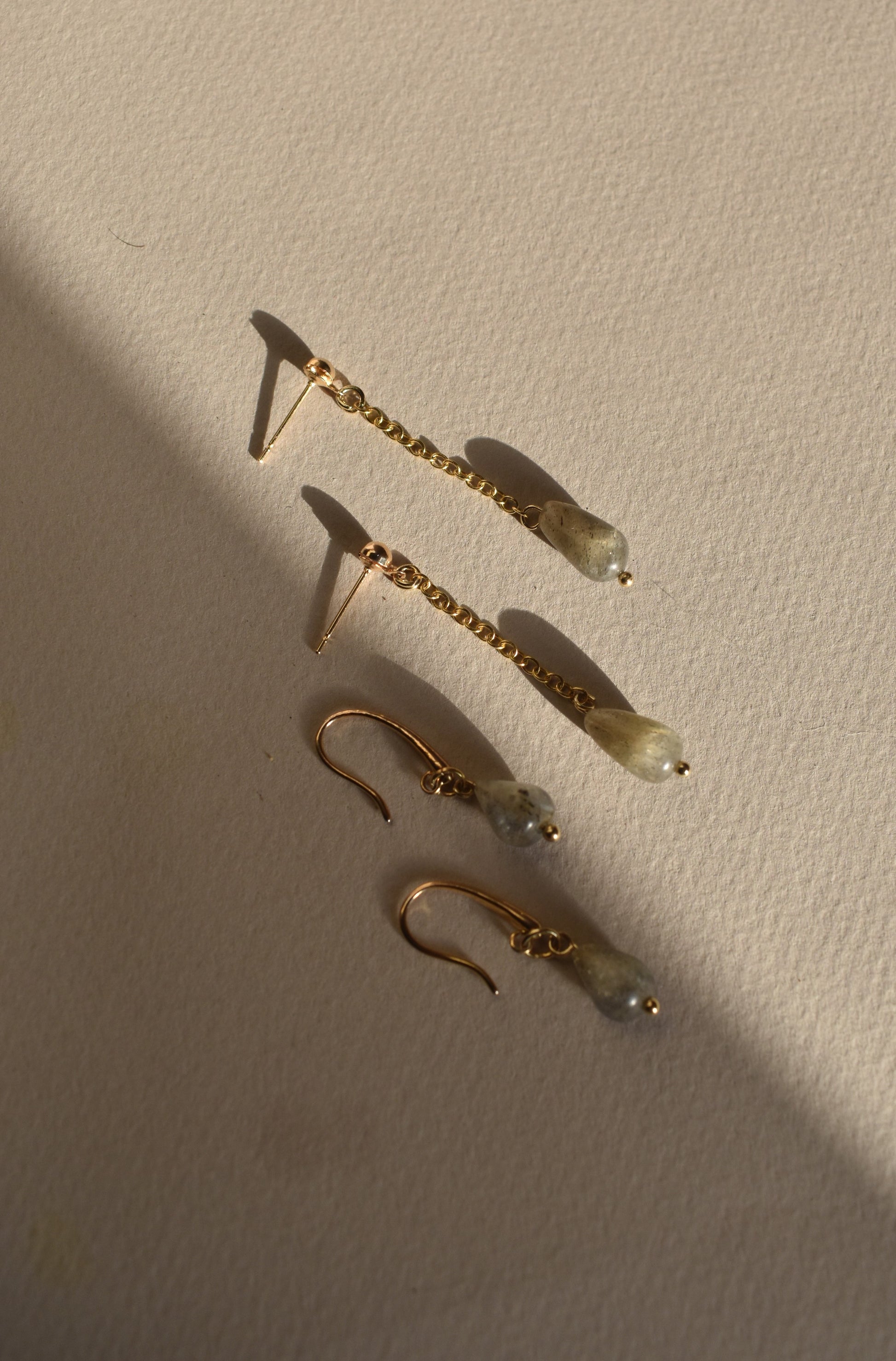 Componentes: Labradorita finamente cortada en forma de gota y facetada (piedra translúcida), arete lámina de oro de 18K